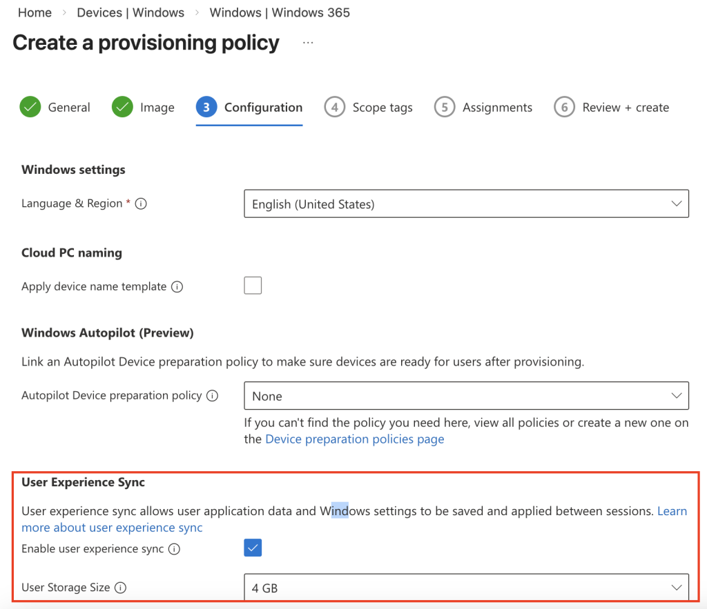 To enable UES, head to Devices > Windows > Windows 365 > Provisioning policies in Intune