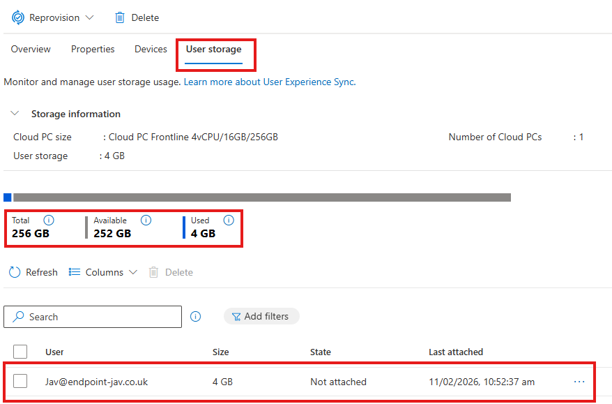 The amount of user storage you are given, is simple to calculate – you take the disk size of your Cloud PC, for example: with 4vCPU/16GB/128GB licenses you’d take 128GB and times it by the number of Cloud PCs in your policy assignment.